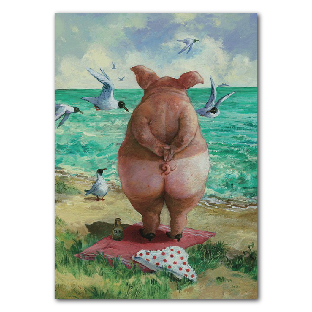 Die Schweinedrama Postkarte mit melancholisch verstimmtem Schwein am Meer